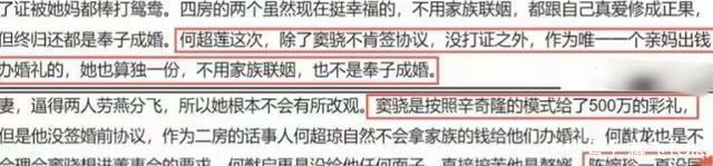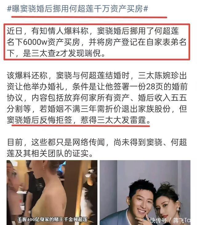 更有爆料称,窦骁结婚后挪用何超莲的千万资金买房,被三太发现,窦骁不同意签署婚前协议,惹得三太大发雷霆。