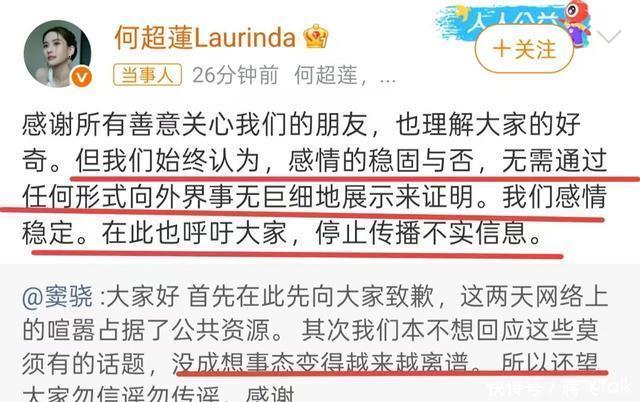 窦骁向大家道歉,抱歉占用了公共资源,请大家不信谣、不传谣。何超莲转发窦骁的文案,表示他们感情稳定,不需要向外界证明,呼吁大家停止传播不实消息。