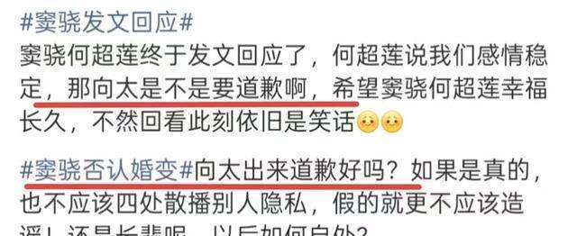 整个事件过程中,都是因为向太开了个头,其他营销号不停带节奏,窦骁何超莲都没讲话,他们因为一些莫须有的爆料挨骂,现在当事人回应了,不少网友喊话向太出来道歉,人家夫妻俩感情稳定,都是因为向太的爆料,才让他们处于舆论中心。